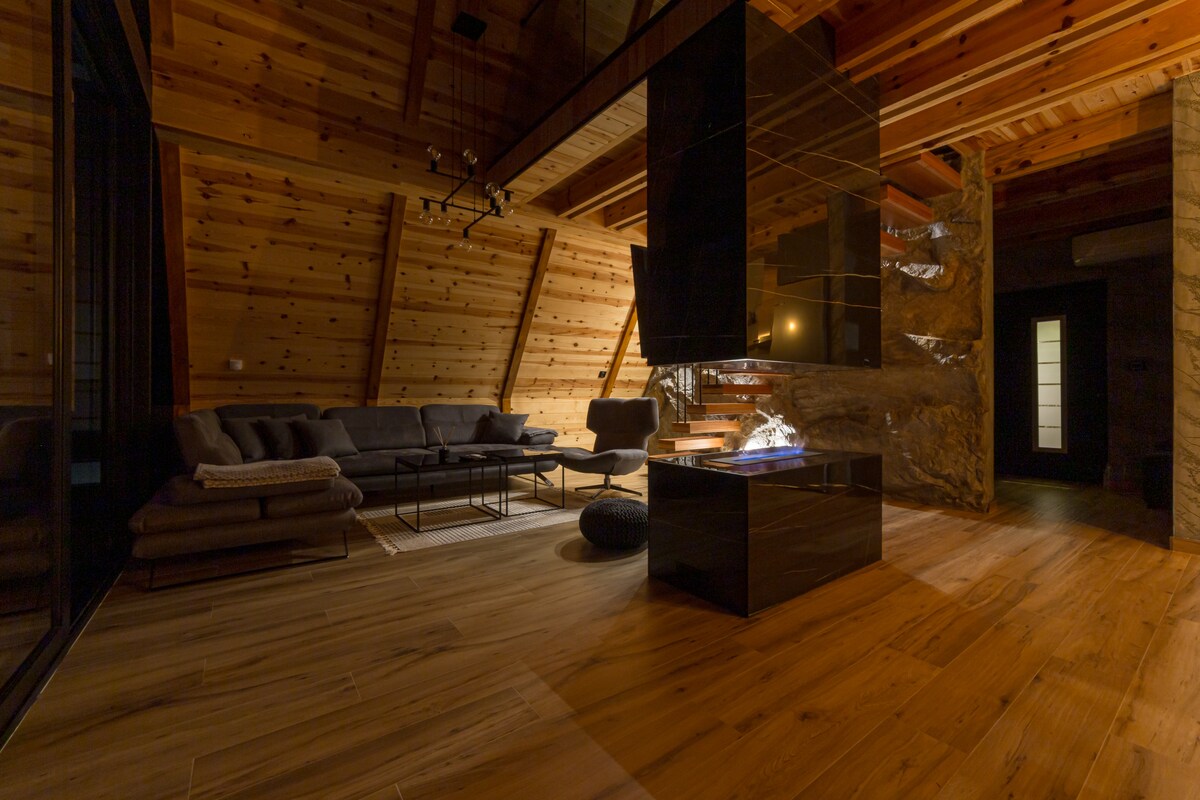 Relax and unwind in this peaceful, stylish space. This wooden mountain cottage offers stunning views in the Mokra Gora mountains on the edge of Tara National Park. Enjoy the peace and tranquility of the beautiful scenery while still being close to all amenities and attractions. The cottage features a cozy living room with an open-plan kitchen, a bathroom, and two bedrooms upstairs. Outside, there's a covered terrace with mountain views, and the house offers plenty of space and privacy.