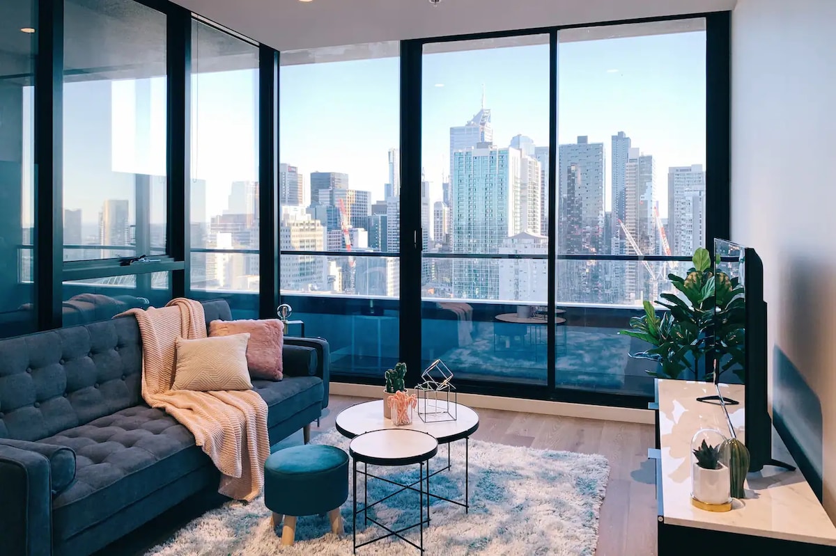Lilly - A beautiful new 1 bedroom CBD designer apartment with the most amazing views over the Docklands, Marvel Stadium and Port Phillip Bay beyond. Literally Just across from Southern Cross Train Station & the SKYBUS which runs direct to the airport every 10 minutes. Complete with 1 Queen bedroom, FREE WIFI.