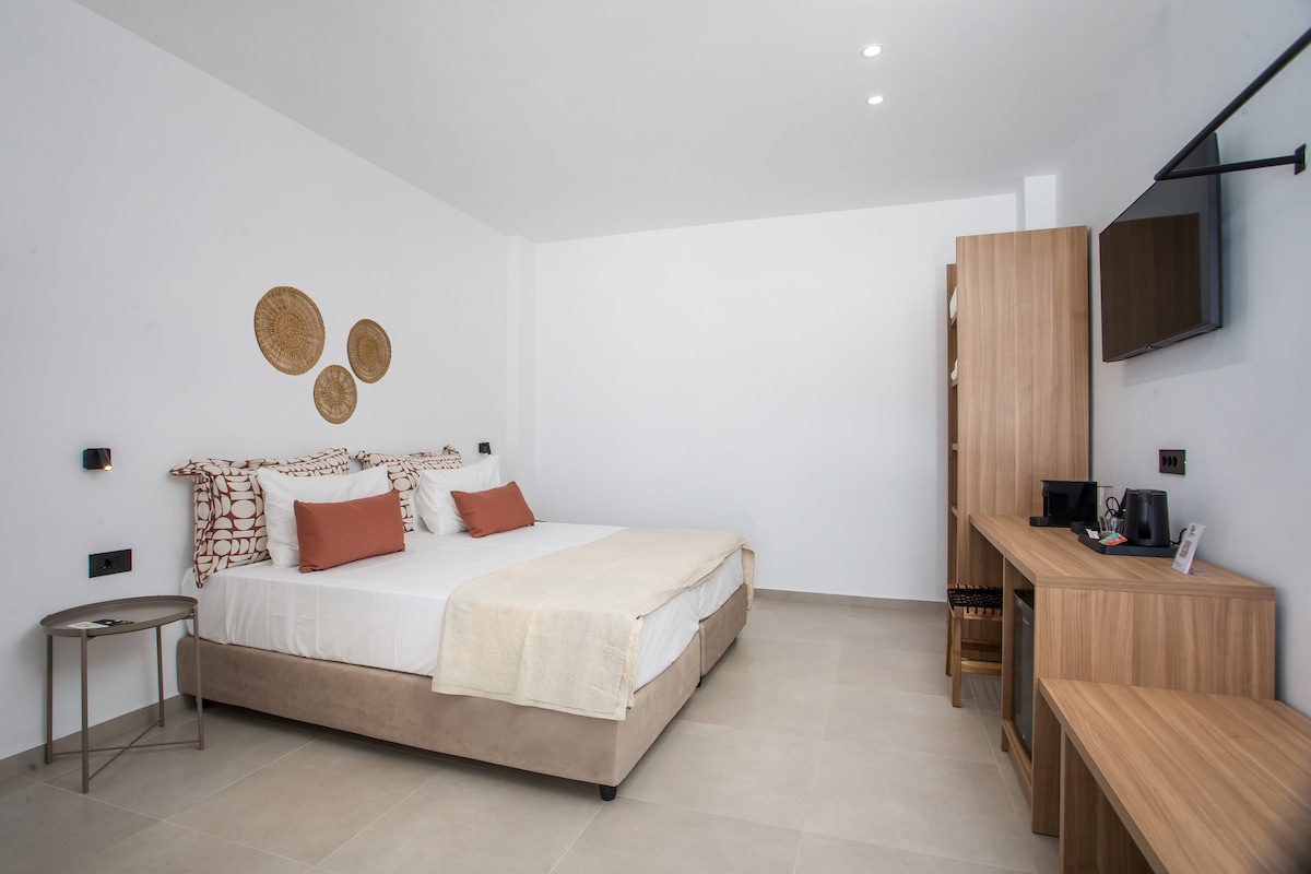 Queen Suite can easily accommodate 1 to 3 persons with one bedroom with double bed, one sofa bed for extra guest, all necessary equipment for making your morning coffee or tea, living room, bathroom with double shower, private furnished balcony and outdoor heated plunge pool with caldera and volcano view.Enjoy easy access to popular shops and restaurants from this charming place to stay.