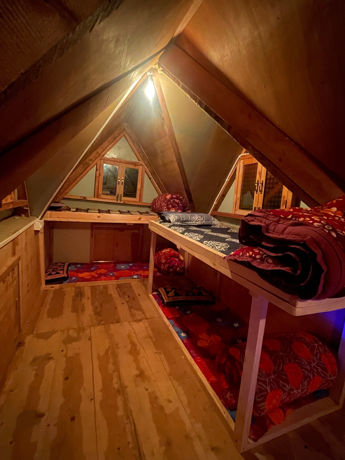 This hip spot offers more than just distinctive decor of Himalayan wood. The homestay is situated at an altitude of 7500 feet in a secluded village called Bhangeli. It is just 46 Km from Uttarkashi The dorm stay is at the attic of the wooden construction with splendid view of mountains and farmland. One can experience gusting Himalayan wind along with coziness & serenity of the place. Parking is just 50 Mts from the property and its safe with proper visibility of your car.