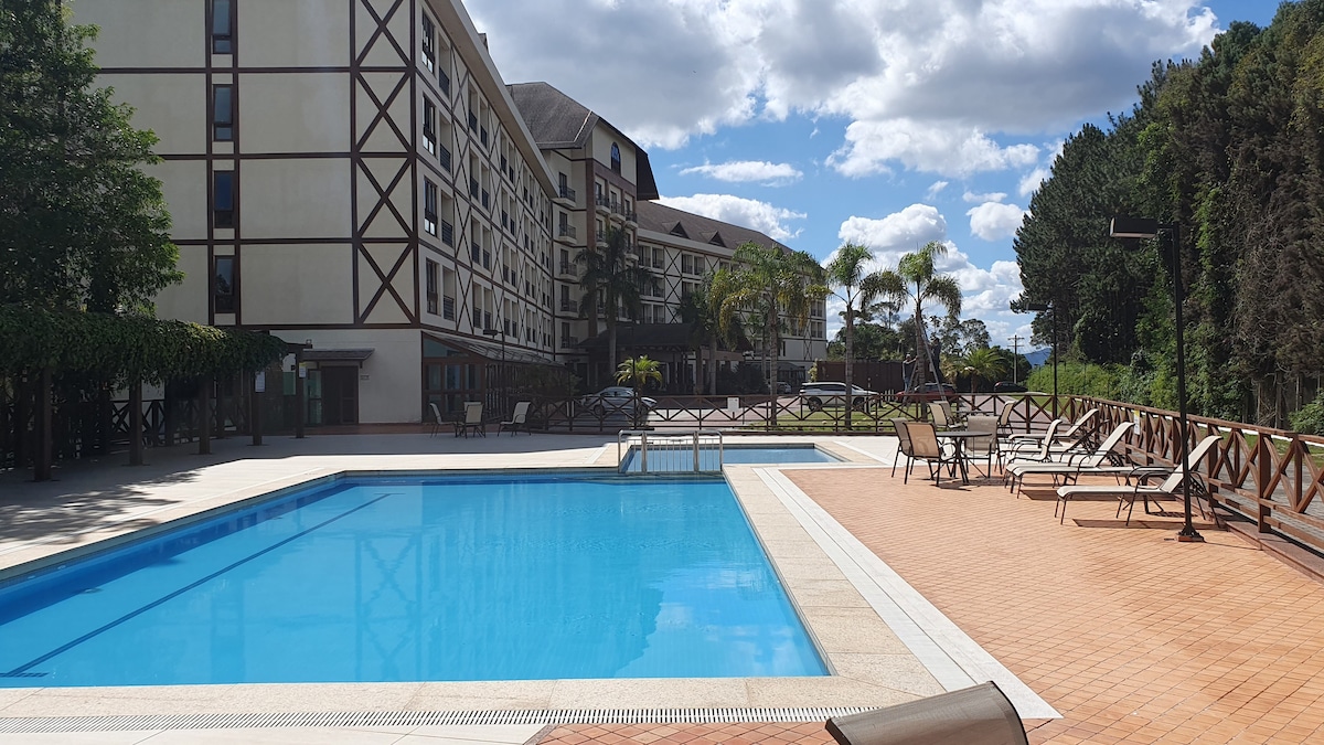 02 quartos acomoda 04 pessoas O parque tem as seguintes atrações: Teleférico Tirolesa (a parte) Ofuros e piscinas aquecidas Complexo com piscinas e 3 taboaguas Recreação das 08 as 22 horas Cinema Academia Pesque pague Fazendinha Passeio de trenzinho Pedalinho Quadras de esportes Salão de jogos