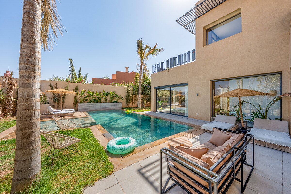 Ta luksusowa willa z 3 sypialniami i prywatnym basenem z widokiem na pole golfowe to idealne miejsce, aby zostawić bagaże, zrelaksować się i odkrywać skarby Marrakeszu we dwoje, z rodziną lub przyjaciółmi. W samym sercu spokojnej przystani łączącej nowoczesność i komfort, w pobliżu centrum miasta (20 minut jazdy samochodem), willa jest w pełni umeblowana i wyposażona na spokojny pobyt. Dla Twojej wygody w czasie pobytu możesz skorzystać z dodatkowych usług (taksówka, kucharz, sprzątanie).