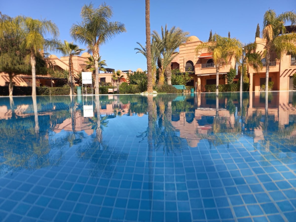 Piękny, przyjemnie umeblowany apartament położony w 24-godzinnym areszcie domowym. Piękne widoki na góry Atlas z 2 wspólnymi basenami i ogrodem. plac zabaw dla dzieci. bliskość supermarketu. Apartment equipped to make your holiday pleasant, the terrace and the garden level allow you to spend sweet evenings with family or friends rezydencja pozwala na spokojne wakacje w pobliżu medyny