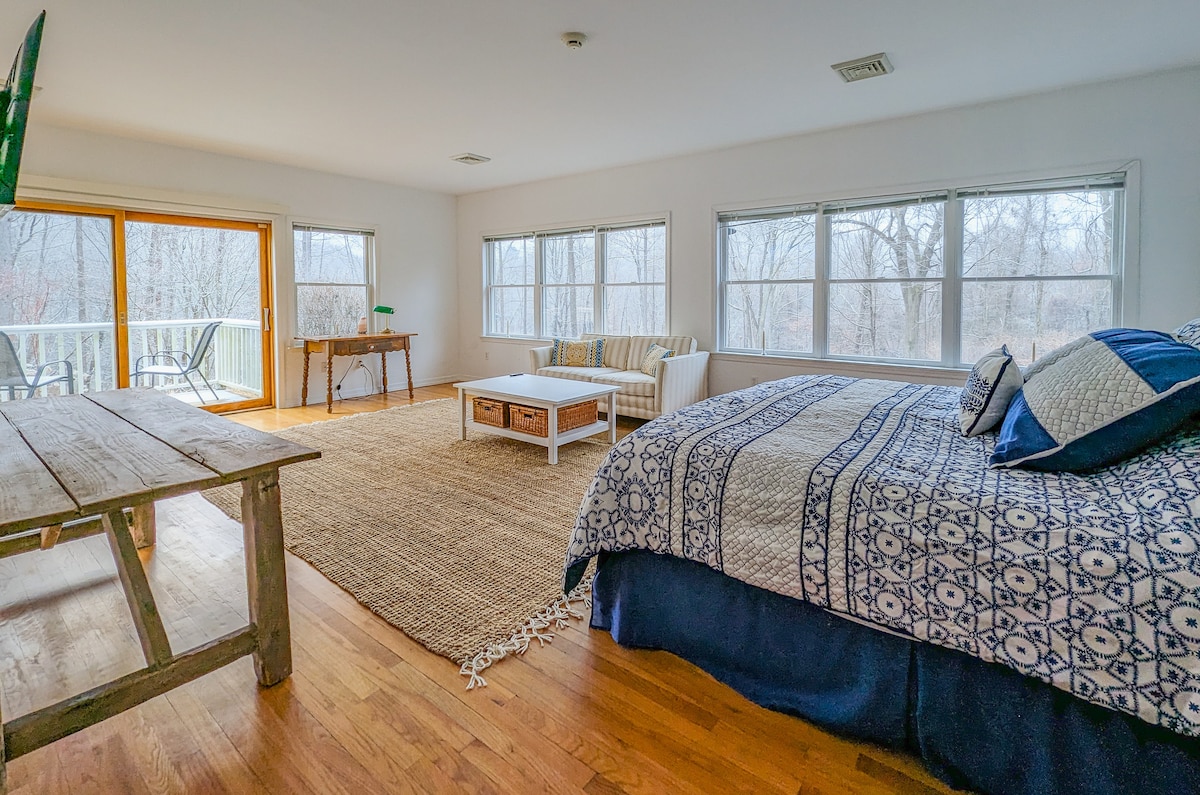 To spokojne sanktuarium czeka na Ciebie w Pawling, gdy wybierasz się na wycieczkę lub zwiedzanie okolicy. Świeży, czysty apartament typu studio z idyllicznym widokiem na las, kamienne mury i odległe góry. Obudź się przy śpiewie ptaków i pięknych widokach. Z łóżkiem typu king size, aneksem kuchennym, biurkiem, telewizorem Smart TV, Wi-Fi, pełną łazienką z kabiną prysznicową. Duże przesuwne szklane drzwi na prywatny taras z widokiem na krajobraz. 1 mila do wioski z restauracjami, piekarniami i nocnymi klubami. 7 minut taksówką do Darryl 's House Club.
