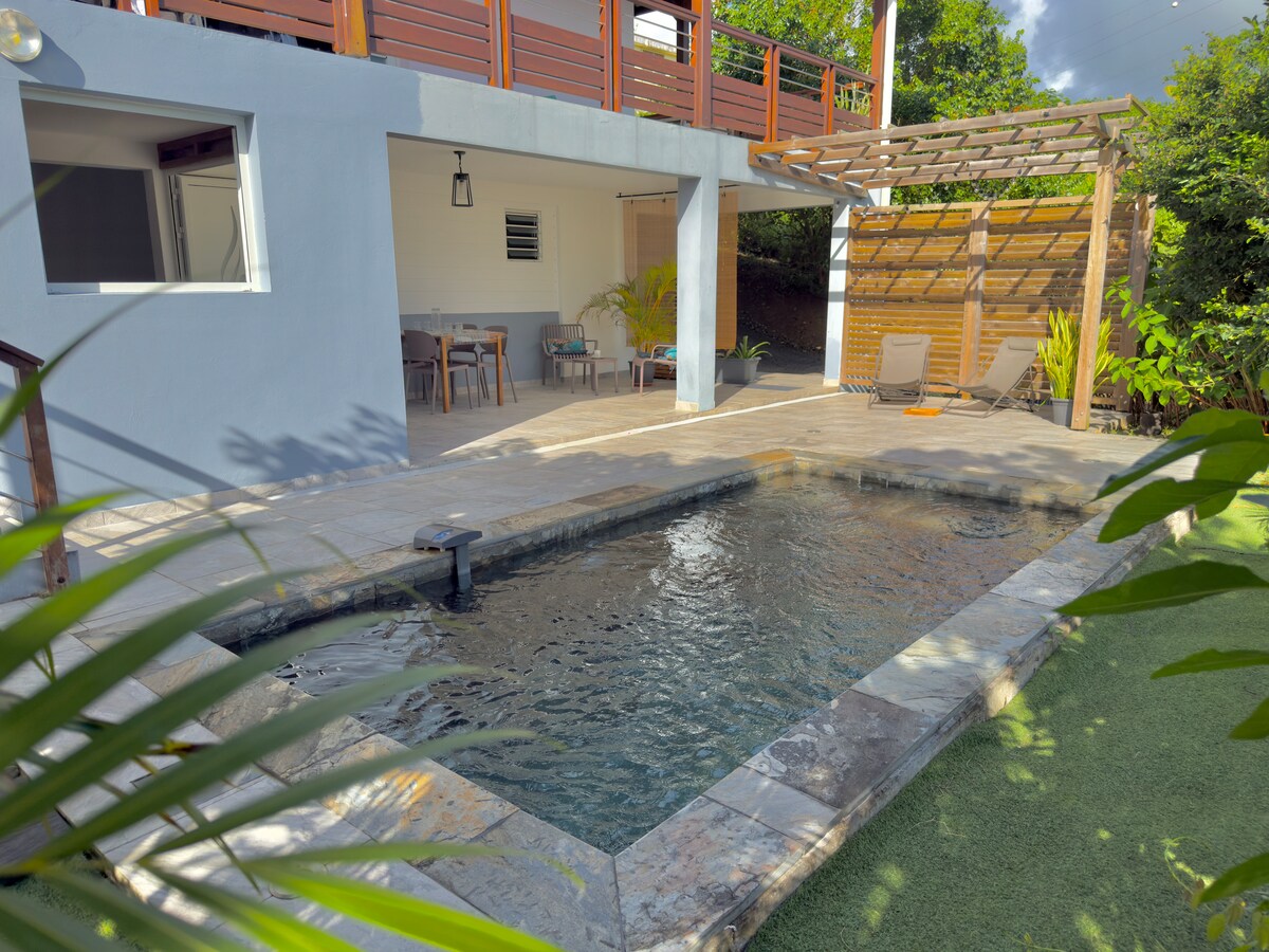 dolna część willi o powierzchni 80 metrów kwadratowych i 80 metrów kwadratowych tarasu położona w gminie Rivière-Pilote w bujnej zieleni, 5 minut spacerem od wioski i 5 minut jazdy od pierwszej plaży Anse figuier - 2 klimatyzowane pokoje - łóżeczko dziecięce - 1 łazienka - toaleta - 1 salon - 1 jadalnia - 1 kuchnia z okienkiem do podawania potraw 1 basen - taras z grillem - taras do czytania - Wi-Fi - pralka telewizja z abonamentem Orange - ręcznik kąpiel