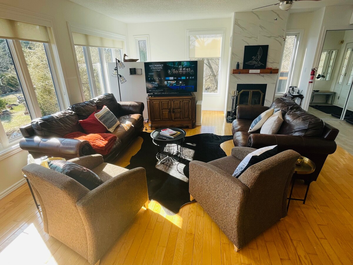 Escape to Chalet Buckingham, a stunning four-season retreat nestled on 3 acres of Ottawa River waterfront. Located just 45 minutes from Ottawa and 5 minutes from the Quyon ferry, this serene getaway is easily accessible and offers a peaceful escape from the city. Enjoy small boats and water toys in summer, cook in the large outdoor kitchen with BBQ + pizza oven, and unwind in the sheltered 8-person hot tub available year-round. Experience tranquility and adventure in one perfect destination.