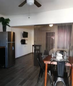 1100 metrów kwadratowych loft z wysokimi sufitami, oknami od podłogi do sufitu, otwartym pomieszczeniem/jadalnią/kuchnią, granitowymi blatami, urządzeniami spożywczymi, pokojem głównym i zadrzewionym podwórkiem. Uwzględniono małe zwierzęta. Moje miejsce znajduje się w centrum miasta, w pobliżu starego miasta, lotniska Sunport, Nob Hill i Uniwersytetu w Nowym Meksyku. Moje miejsce jest dobre dla par, samotnych poszukiwaczy przygód i futrzastych przyjaciół (zwierząt).