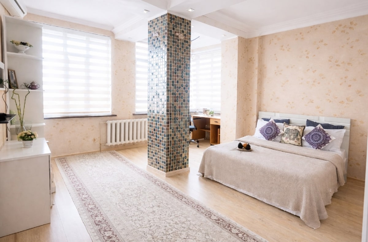 Stylowy apartament w samym sercu Duszanbe Witamy w naszym nowo odnowionym apartamencie na poddaszu, nowoczesnej i wygodnej przestrzeni zaprojektowanej tak, aby Twój pobyt w Duszanbe był niezapomniany. Apartament ma stylowe wnętrze, wysokiej jakości meble i wszystkie udogodnienia potrzebne do relaksującego pobytu – służbowego lub rekreacyjnego. Położony w centrum miasta, zaledwie kilka kroków od popularnych restauracji, kawiarni, banków, sklepów i supermarketu. Wszystko, czego potrzebujesz, jest tuż pod Twoimi drzwiami.