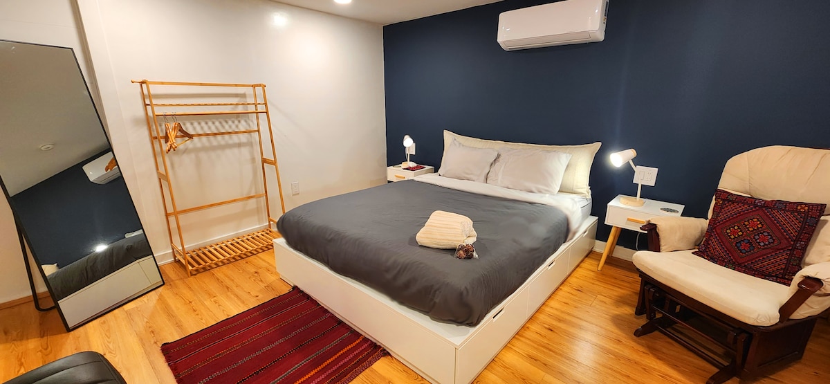Ten nowoczesny apartament typu studio jest idealny na weekendowy wypoczynek lub bazę do pracy zdalnej. Zaledwie 17 minut drogi od Omegi oferujemy łóżko typu Queen, bezpłatne WiFi i telewizor Smart TV. W pełni wyposażony aneks kuchenny i bar do pracy/jedzenia ułatwiają przygotowywanie posiłków i produktywność. Łazienka jest wyposażona w słuchawkę prysznicową i głośnik Bluetooth. Dzięki własnemu wejściu i dużemu parkingowi na ulicy zapewnia prywatność i wygodę. Spróbuj – nie zawiedziesz się!