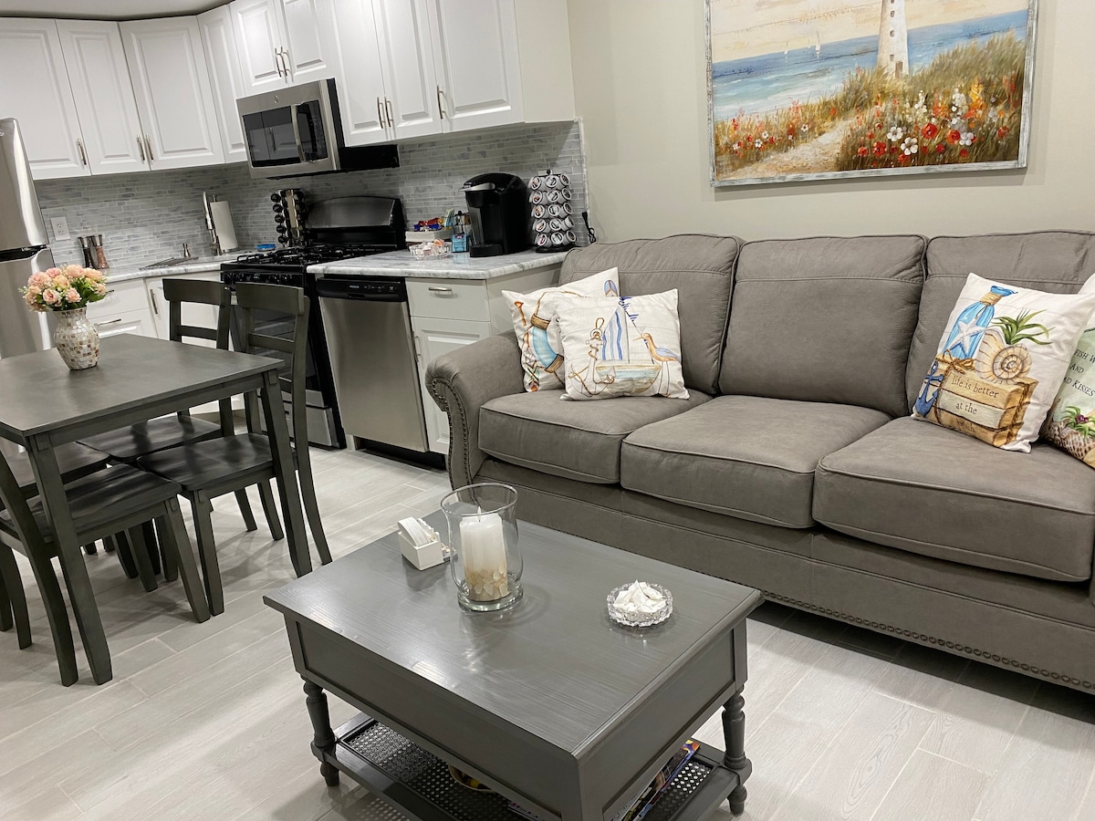 Apartament dwupoziomowy w Bayside w rejonie Brant Beach w LBI ze wszystkim, czego potrzebujesz, aby świetnie spędzić rodzinne wakacje! 1 przecznica od oceanu i krótki spacer do wielu restauracji i sklepów. Położony przy cichej ulicy nasz dom może pomieścić 5 osób i posiada 2 sypialnie, 2 pełne łazienki, klimatyzację, otwarty plan piętra, kuchnię ze stali nierdzewnej i granitu, salon i werandę. ZAKAZ PRZYWOŻENIA ZWIERZĄT/ZAKAZ PALENIA. Zameldowanie 14:00 i wymeldowanie 10:00. 2 odznaki plażowe są dołączone do krzeseł i gier.