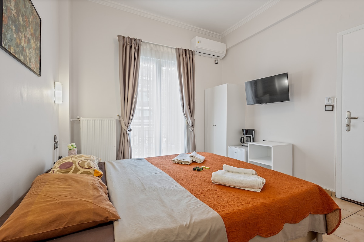Jasny, komfortowy pokój o czystym, nowoczesnym wystroju i delikatnych, neutralnych tonach, oferujący przytulny pobyt w samym sercu Aten. Ciesz się wygodnym podwójnym łóżkiem, drewnianymi podłogami, nowoczesną łazienką z prysznicem, klimatyzacją, bezpłatnym Wi-Fi i lodówką na niezbędne rzeczy. Duże okna zapewniają widoki na miasto i wypełniają pokój naturalnym światłem. Rozpocznij dzień od bezpłatnej kawy w lobby i zakończ go na dachu z panoramicznym widokiem i relaksującym jacuzzi.