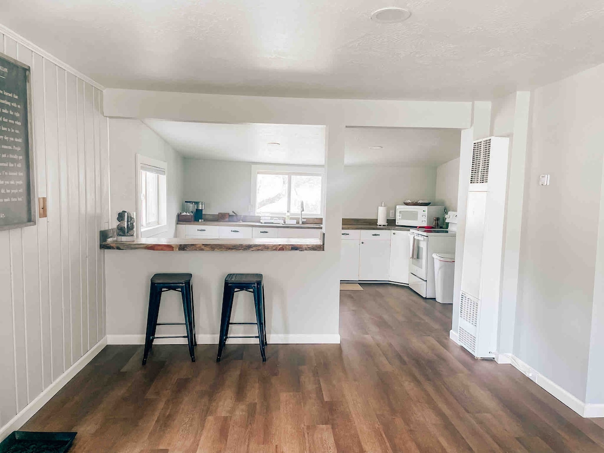 Bright, newly renovated private apartment with stunning Mount Helena views. This stylish retreat comfortably fits 3 guests and features a dedicated workspace with fiber internet, a full kitchen, and vintage decor. Enjoy views of Mount Helena, a fully stocked coffee bar, and cozy queen bed. Perfect for a relaxing getaway or remote work. Beds: Queen in the bedroom and a twin cot in the living room.