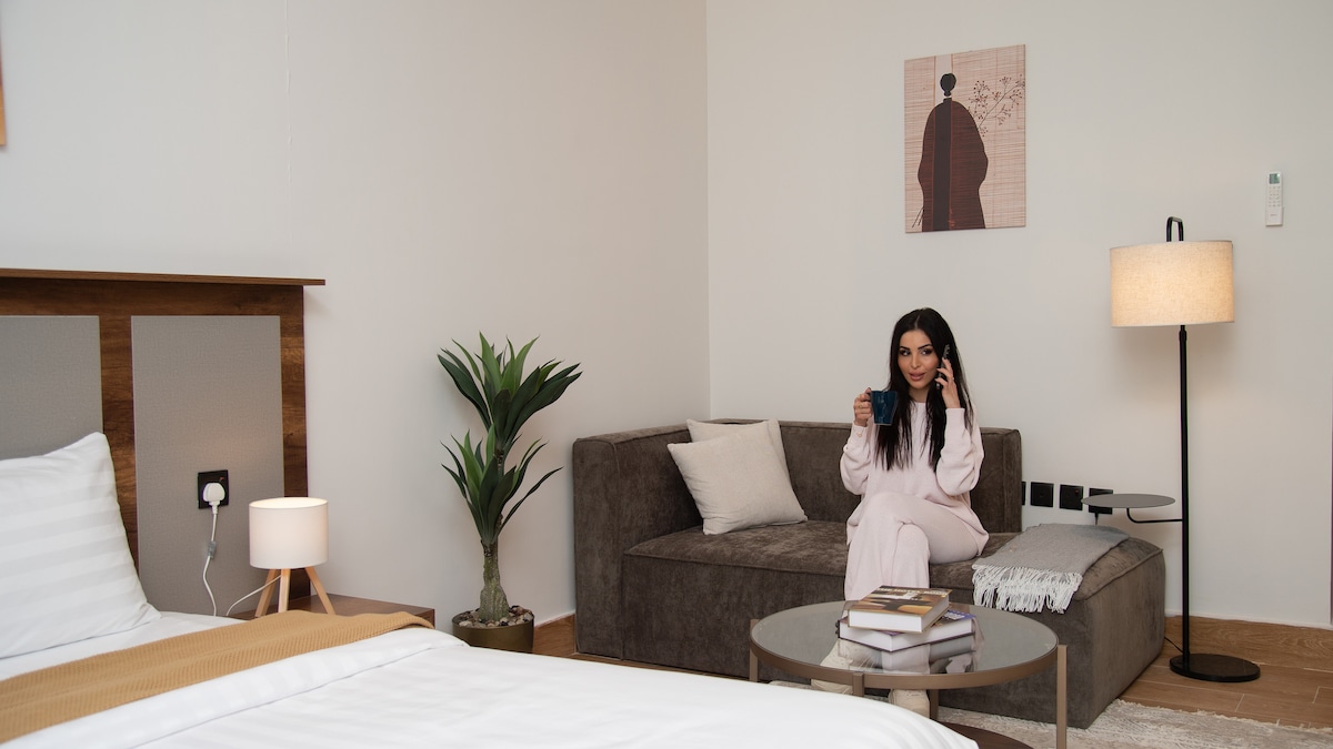 Witamy w Y, przestronnym i nowo wybudowanym luksusowym mieszkaniu w Khobar, zaledwie kilka minut od Bahrain Causeway. Ten elegancki ośrodek wypoczynkowy ma jedną sypialnię, pokój gościnny i nowoczesną łazienkę, wszystkie zaprojektowane z myślą o wygodzie i stylu. Dzięki hojnemu układowi i wysokiej klasy wykończeniom, Y jest idealnym miejscem dla podróżnych szukających przestrzeni i relaksu . Ciesz się łatwym dostępem do restauracji, sklepów i głównych autostrad lub zrelaksuj się w swoim spokojnym, nieskazitelnym sanktuarium. Niezależnie od tego, czy podróżujesz służbowo, czy rekreacyjnie, Y obiecuje niezapomniany pobyt.