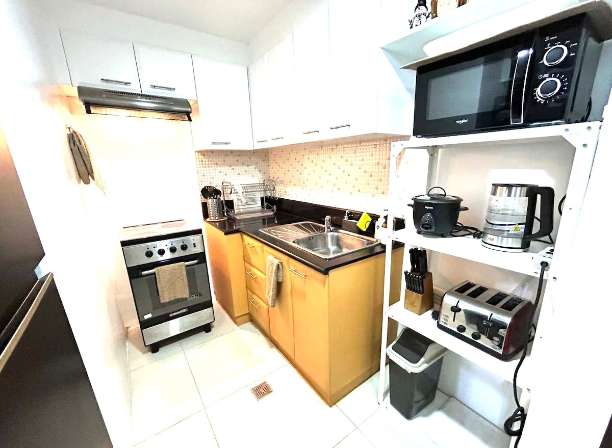 Zrelaksuj się w tym przytulnym mieszkaniu w sercu Eastwood, Quezon City. To mieszkanie o powierzchni 36 m² zostało zaprojektowane tak, aby zapewnić wystarczającą przestrzeń dla 4 osób dorosłych z dziećmi. Posiada w pełni wyposażoną kuchnię z lodówką, kuchenką mikrofalową, czajnikiem, naczyniami i przyborami kuchennymi, dzięki czemu goście mogą gotować w dowolnym momencie. Posiada łóżko typu queen-size, 2 pojedyncze łóżka (w łóżku na poddaszu), półpodwójną sofę i wysuwane łóżko. Nie musisz znosić materacy podłogowych. Oglądaj na 50-calowym telewizorze 4k UHD z bezpłatnym Wi-Fi i dostępem do Netflix, Disney+, HBO, Apple TV+, AmazonPrime