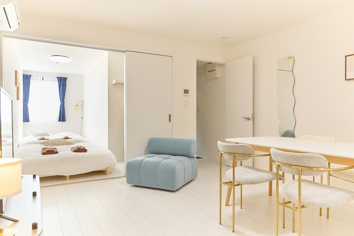 Ten całkowicie prywatny apartament typu studio o powierzchni 26 m² jest idealnie położony zaledwie 7 minut spacerem od stacji Ebisu i tylko 3 minuty pociągiem od Shibuya. Pokój oferuje spokojną i wygodną atmosferę, wyposażony w podwójne łóżko i rozkładaną sofę. Goście mają do dyspozycji telewizor Smart TV z Netflixem i niezawodne Wi-Fi, dzięki czemu apartament jest odpowiedni nie tylko na zwiedzanie, ale także na pracę zdalną i dłuższe pobyty.