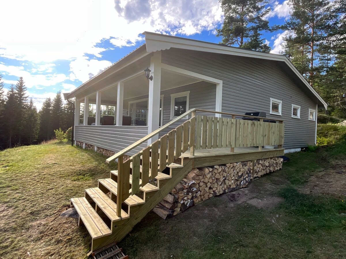 Dyskretny i duży domek z panoramicznym widokiem na jezioro Ränken i prywatną „linią brzegową”. „Nowo wybudowany i przytulny 2-piętrowy domek/ domek ukończony w 2013 roku - z 3 sypialniami, dużą jadalnią, oddzielną kuchnią, kominkiem i dużym tarasem, molo Lato/wiosna/jesień jest miła dla tych z Was, którzy chcą pływać, łowić ryby, wiosłować, trenować, robić zakupy, zbierać grzyby i jagody, grill itp. Okolica jest zaplanowana i jest łatwo dostępna dzięki przyjemnej aktywności/kąpielom dla małych i dużych.
