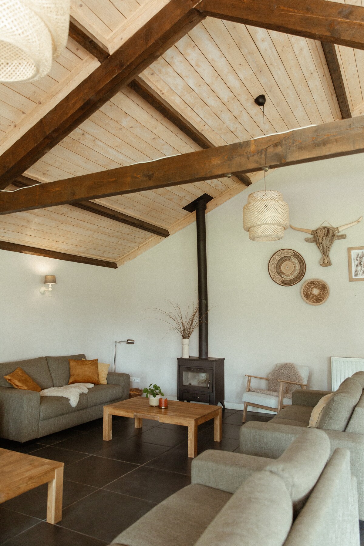 Direct aan de bossen, Het huis heeft acht slaapkamer met ieder een eigen badkamer, een ruime leef- en woonkeuken en een overdekt terras. Bij de loungebanken vind je de houtkachel. De keuken is volledig uitgerust met een 6-pits gasfornuis, oven, koffiezetapparaat, magnetron, vaatwasser en grote koelkast. In totaal zijn er 8 ruime slaapkamers, elk met eigen douche, toilet en wastafel. Slaapkamers zijn voorzien van opgemaakte bedden. Het overdekte terras geeft uitzicht op de bossen.