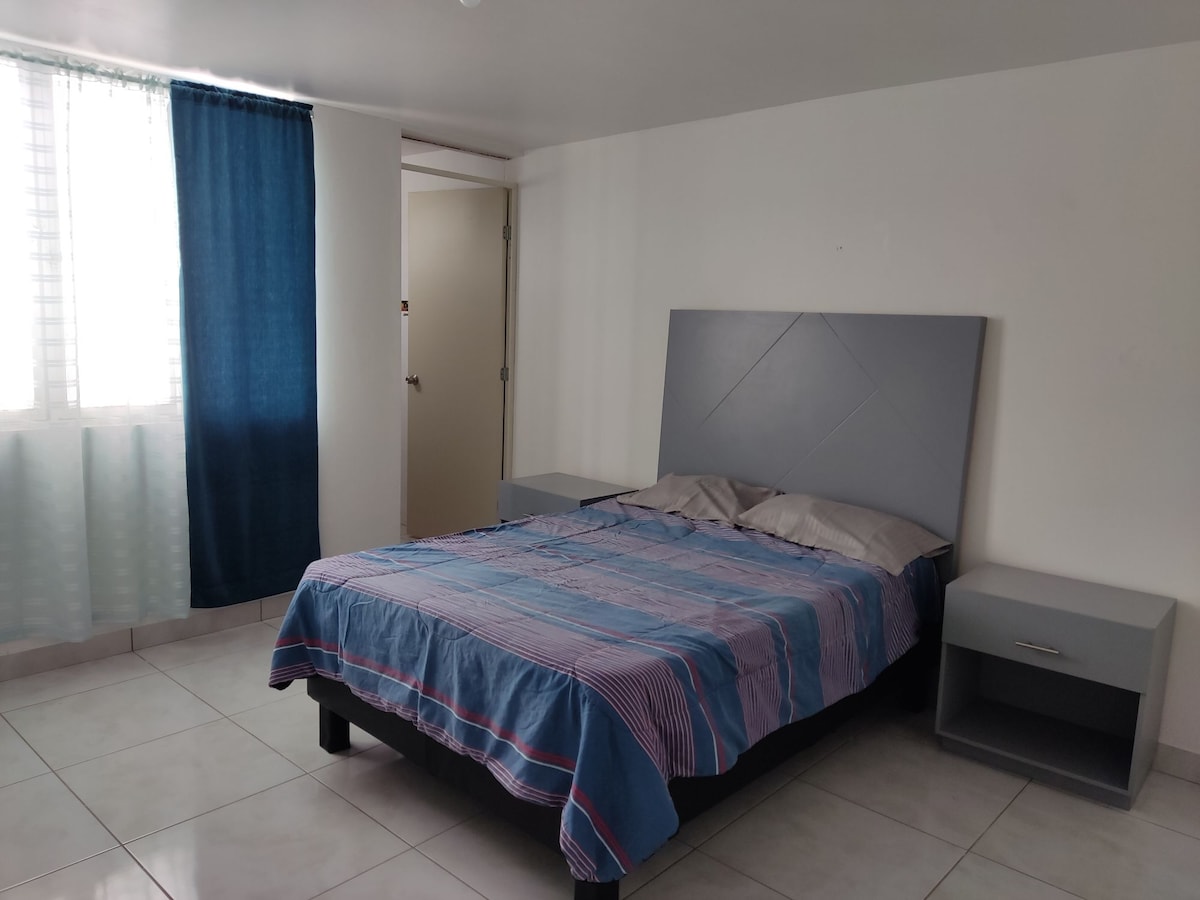 Przestronny apartament na piętrze z wyposażoną kuchnią, zamkniętym garażem, sypialnią z łazienką i tarasem. W Colonia Las Praderas, niedaleko Plaza Patio. Bezpieczna i łatwo dostępna przestrzeń. Przyjazd jest niezależny. Możesz odebrać klucze w dowolnym momencie w skrzynce pocztowej. Usługi obejmują: internet, ciepłą wodę, pralkę, wentylator sufitowy, podwójny minisplit (gorące/zimne), przybory kuchenne, taras z leżakami i grill. Przestrzeń nie jest współdzielona z innymi gośćmi.