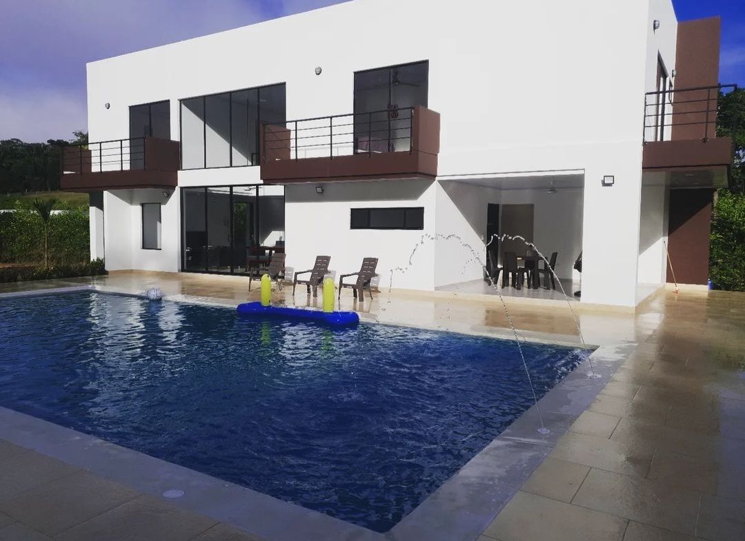 Este nueva casa, es un lugar ideal para relajamiento con elegancia moderna en un ambiente von decoración tradicional. Baños y alcobas amplios. Cocina integral con marmol negro que hace parte de la decoración de una sala a doble altura que hace muy fresca toda la casa. Su piscina es amplia y al lado de la cocina y la zona de bbq es ideal para maestros de las barbacoas. Amoblada y equipada.