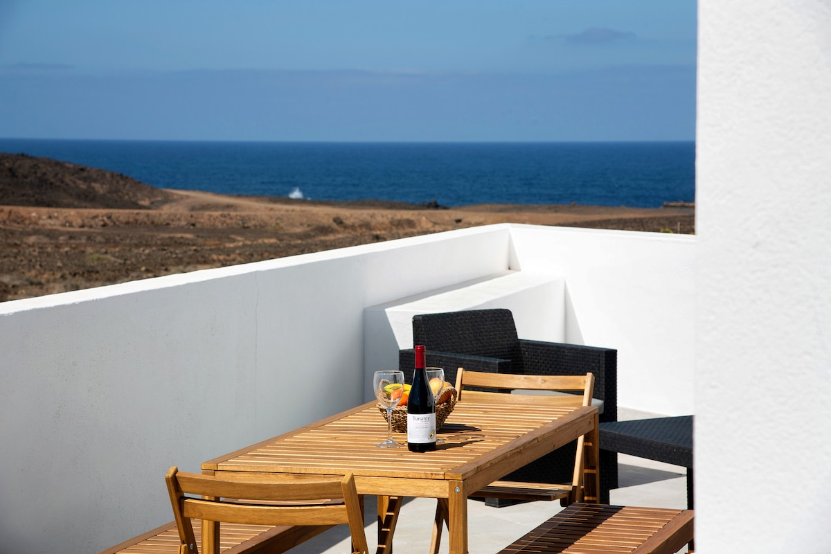 Stay in one of two charming 80 sq m modern hippie apartments with a unique view of Timanfaya National Park and its volcanoes. The apartment features a fully equipped kitchen, a living room with panoramic sliding doors and a sofa bed, HDTV, fiber optic internet, and a bedroom with a Canarian-style en-suite bathroom. Relax on your private terrace, dip your toes in the César Manrique saltwater pool, enjoy the endless vistas, and marvel at magical sunsets. 🩵