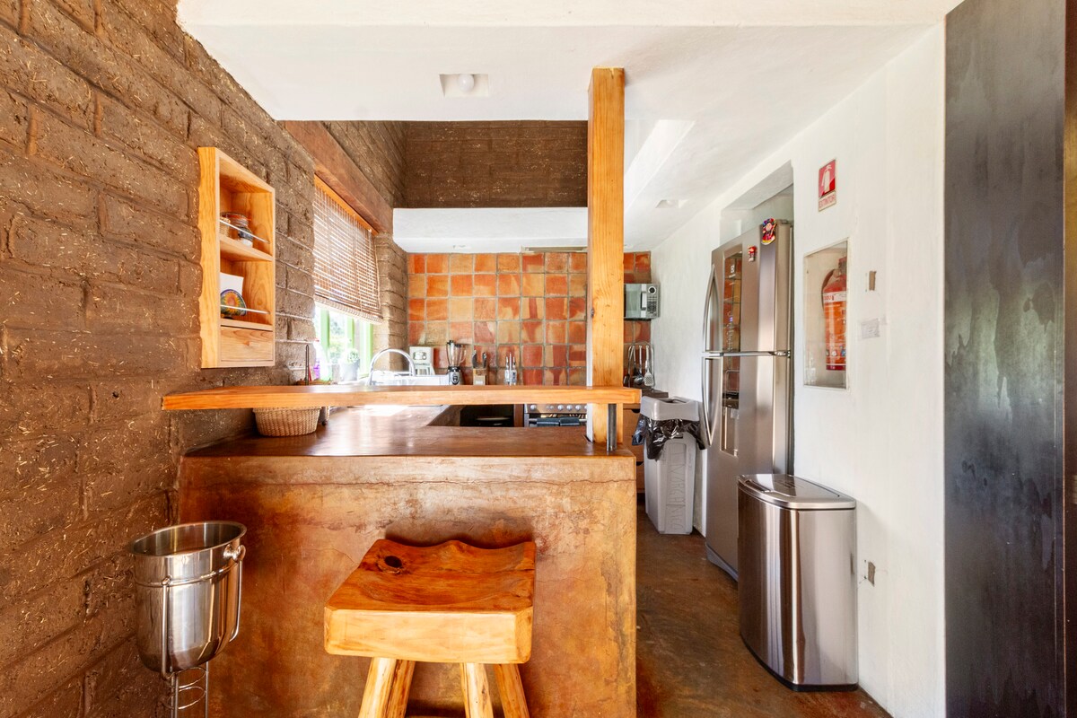 Bungalow de adobe en el centro de un hermoso jardín de 1000m2 privado rodeado de árboles, perfecto para parejas donde puedes desconectarte del estrés de la ciudad, inspirarte para hacer un buen diseño, hacer una fogata en la noche o simplemente echarse una siesta en la hamaca y disfrutar de la naturaleza. Estamos estrenando cuarto nuevo y algunas remodelaciones para mejorar la estancia y experiencia!