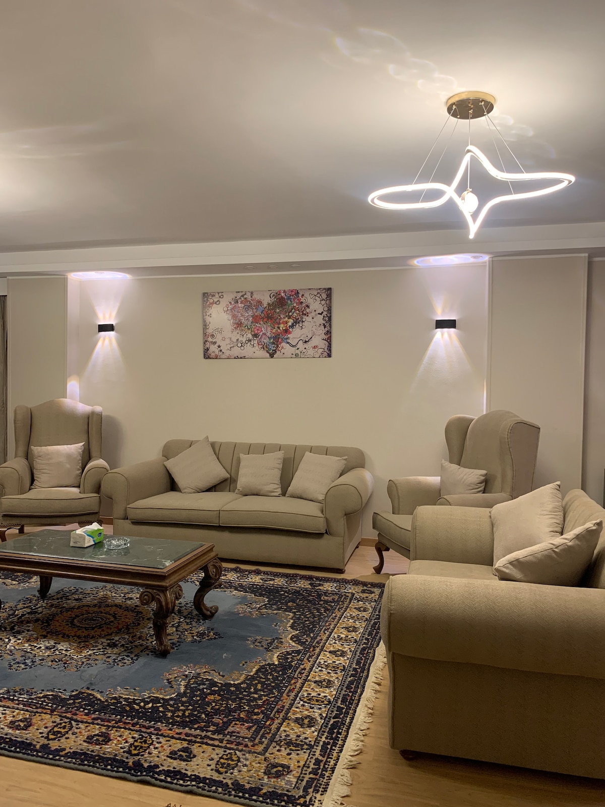 „Rozkoszuj się pobytem w nowoczesnym, przytulnym domu z 2 sypialniami, zaledwie 900 m od Life Eye Resort i 2 km od Narodowego Muzeum Cywilizacji Egipskiej. Nasz przestronny apartament oferuje Wi-Fi, telewizor Smart TV, parking i bezpłatny odbiór z lotniska w Kairze. W pobliżu znajdziesz kawiarnie, restauracje i centrum miasta, więc możesz cieszyć się komfortem i kulturą w jednym miejscu”.
