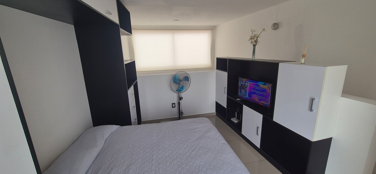 Hermoso Departamento con amplia terraza, limpio y muy acogedor. la construcción es nueva, así como los muebles que hay en su interior. el departamento es de concepto abierto, solo hay un biombo que separa el área del dormitorio con la sala, para dar un poco de privacidad. Hay un sofá cama, tamaño matrimonial, en la sala El departamento tiene amplias ventanas que brindan una excelente iluminación. y cuenta con una linda terraza, rodeada de plantas.