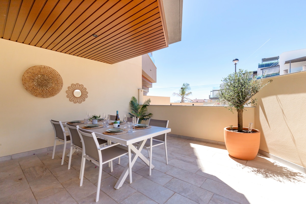 Na najwyższym piętrze z pięknym widokiem na morze z dwóch dużych tarasów znajduje się ten luksusowy apartament. Trzy sypialnie i dwie łazienki, duża kuchnia i salon z otwartym planem.