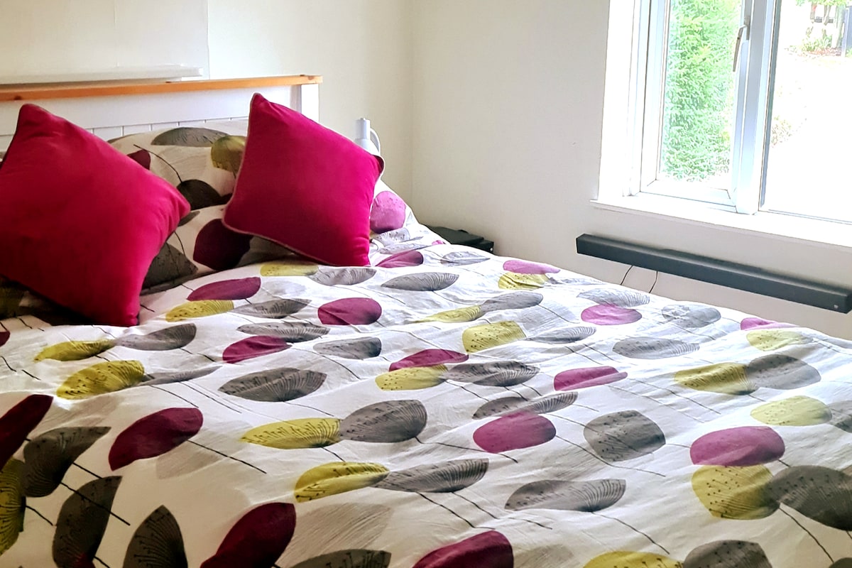 Jest to samodzielny aneks nad podwójnym garażem (należy pamiętać o niskich kątach dachu w miejscach) z niezależnymi drzwiami. Posiada jedno duże łóżko z miejscami do siedzenia oraz telewizor i stół do jadalni. Do dyspozycji gości jest mały aneks kuchenny z kuchenką mikrofalową, lodówką, czajnikiem i tosterem. Łazienka z prysznicem elektrycznym i zwykłymi udogodnieniami. Dostępny jest internet. Jeśli chcesz zabrać ze sobą dziecko, skontaktuj się z nami przed sprawdzeniem, czy jest ono odpowiednie. Parking znajduje się przy głównej drodze lub naprzeciwko w pobliżu.