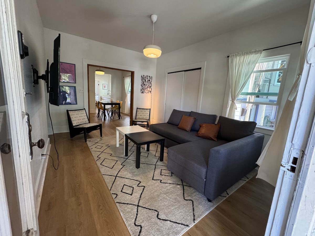 Downstairs unit/private entrance Bright downstairs unit w/master bedroom & living room or bedroom-you choose. Private entrance. Private bath. Fridge, but no kitchen. High-speed Wi-Fi, & antenna TV. Perfect for larger groups & can sleep 5. Parking is FREE in the neighborhood & the home is located in the transitioning, yet up & coming Portola neighborhood, which is 21 min. to downtown & 16 min. from the airport! Please Note: We live in upstairs unit & you can hear our footsteps at times.