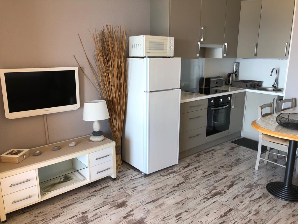 Studio z widokiem na morze na 5 piętrze z windą. Dostęp dla osób niepełnosprawnych. Sklepy i plaża w odległości 50 m. Wyposażona kuchnia z lodówką, płytą indukcyjną, kuchenką mikrofalową z grillem, ekspresem do kawy i ekspresem Senséo. Rozkładana sofa (145 x 195), telewizor, klimatyzacja, Wi-Fi. Zamykany balkon z grillem. 2 łóżka piętrowe. Pralnia samoobsługowa, sklep spożywczy w pobliżu. Karta wstępu do parkingu podziemnego oddalonego o 500 m, bezpłatnego w okresie od 1 lipca do 31 sierpnia. Pościel i ręczniki na życzenie (10 euro/osobę). Basen czynny od końca kwietnia do początku października (skrócony czas pracy na mocy zarządzenia prefekta)