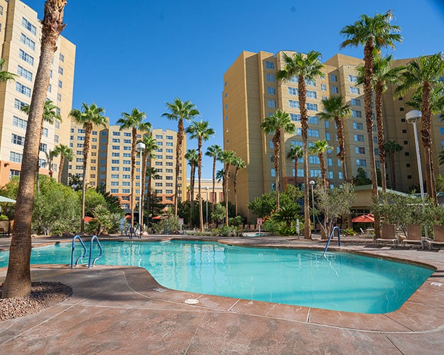 A Mediterranean-style vacation retreat just one mile from the Las Vegas Strip, the three towers offer exceptional views of the dazzling Las Vegas skyline, desert mountains, and the resort's lush courtyard. Lounge by the resort pool, pick up a coffee from the on-site Starbucks, or grab a bite to eat. Outside the resort, you can enjoy outdoor fun at picturesque locations like the Grand Canyon, Lake Mead, and Red Rock Canyon. Plus, catch the famous fountain show at the Bellagio.