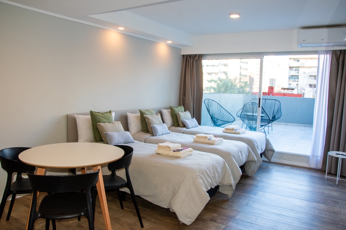 Komfortowy centralny dupleks w Rosario półtora przecznicy od Av. Pellegrini. Na górze znajduje się podwójne łóżko, pojedyncza, mała szafa i klimatyzacja ciepła/zimna. Na parterze znajduje się futon dla 2 osób, telewizor, kuchnia wyposażona w lodówkę, kuchenkę mikrofalową, elektryczny stojak i naczynia (bez piekarnika/kuchni), pełna łazienka z prysznicem i bidetem. Obejmuje Wi-Fi, pościel i ręczniki. Idealne do komfortowego odkrywania miasta. Mamy nadzieję, że wkrótce będziemy mogli Cię poznać.