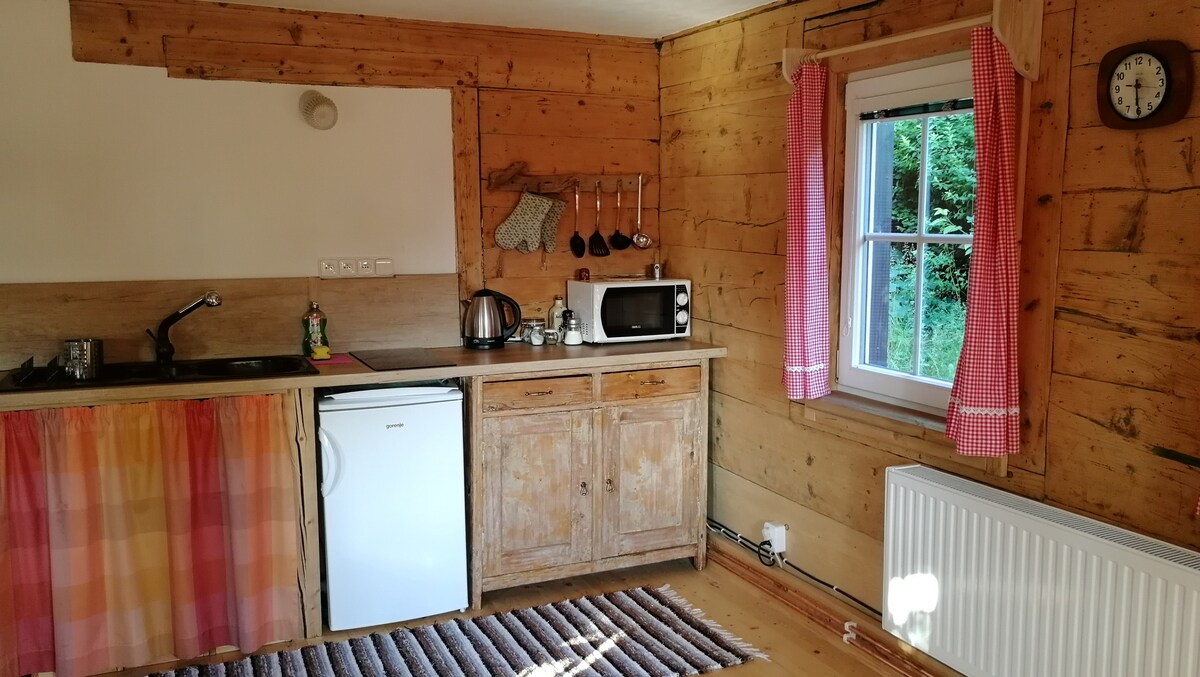 Mała przytulna górska chatka, z dala od stresu i zgiełku, ustronna lokalizacja (około 100 m do najbliższego domu) położona w małej leśnej posiadłości. Miejsce na ognisko / grilla, a także publiczny plac zabaw i odkryty basen w bezpośrednim sąsiedztwie. Zimą (ze śniegiem) stok narciarski i saneczkowy bezpośrednio przy domu (prywatny - bez windy) znajduje się duże łóżko (3 materace) i rozkładana sofa. Brak Wi-Fi, słabe połączenie z telefonem komórkowym. Samochód dostępny latem na ścieżce łąkowej. Zimą ok. 100 m spacerem. Podstawowy wybór ogrzewania.