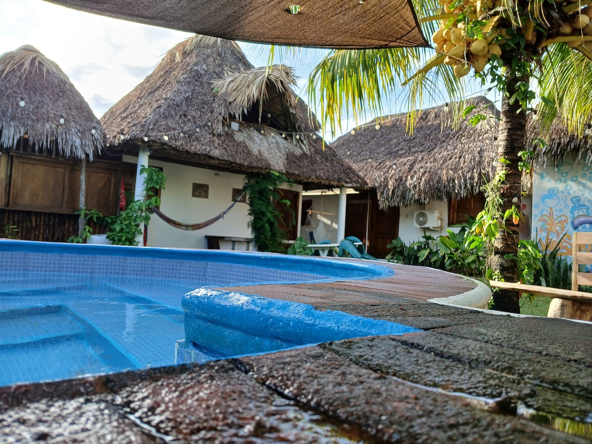Dom na plaży, 100 metrów od morza, z dużym basenem (11 metrów długości) ze słodką wodą. **ZAMIELDOWANIE 10:00 - WYMELDOWANIE 15:00** Sypialnie z klimatyzacją, wyposażona kuchnia i prywatny parking. Dom jest otoczony i dostarczany w komplecie z czystymi prześcieradłami i poduszkami. Nie ma wspólnej przestrzeni z innymi osobami. Niskie pojazdy mogą wjeżdżać bez żadnych trudności. Znajduje się przy 5 km drogi do Monterrico, po przekroczeniu mostu z Iztapa do Monterrico.