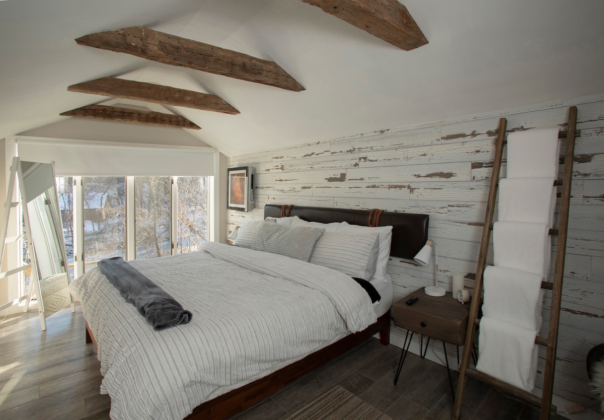 Słuchaj wodospadu podczas snu. Zrelaksuj się w tym romantycznym miejscu nad wodą o nowoczesnym, rustykalnym wystroju. Prywatne wejście, apartament z 2 pokojami, łóżko typu king size z luksusową pościelą. 5 minut spacerem do serca Saugerties ze świetnymi sklepami i restauracjami. Rozkoszuj się poranną kawą na prywatnym tarasie z widokiem na wodę. Jeśli masz szczęście, możesz zobaczyć przelatującego orła bielika lub dostrzec Sopie, fokę portową, która czasami bawi się na brzegu.