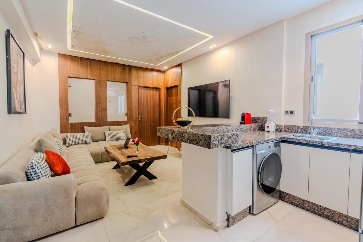 Appartement lumineux et raffiné de 100 m², subtilement décoré dans un esprit marocain élégant, mobilier sur-mesure et finitions soignées. Il offre 2 chambres pleines de charme, un salon spacieux avec cheminée et coin repas, une cuisine ouverte toute équipée, une grande salle de bain et deux balcons baignés de soleil. Parfait pour un séjour à deux, en famille, entre amis. Nichée dans un quartier authentique et vivant, à deux pas des commerces, à 10 minutes de la plage et 20 min de la Médina.