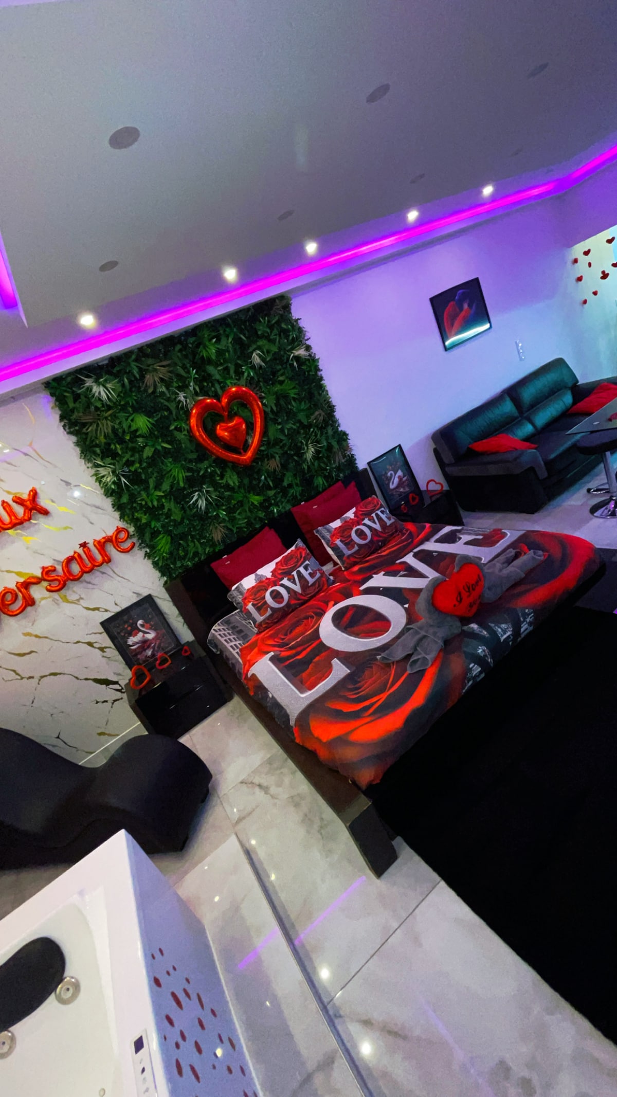 Szukasz zmysłowego i ekskluzywnego kokonu? Przyjdź i ciesz się magiczną nocą w naszym Love Room i stwórz niezapomniane wspomnienia. Czy jest coś lepszego niż balneo z funkcją jacuzzi i koloroterapii, które rozbudzą wszystkie Twoje zmysły? Akcesoria takie jak Krzyż Świętego Andrzeja, huśtawka lub sofa Tantra pozwolą Ci odkryć lub ponownie odkryć Twojego partnera... ponieważ wszystko jest zaprojektowane tak, abyś mógł spędzić wspaniały pobyt pod znakiem cielesnych przyjemności...