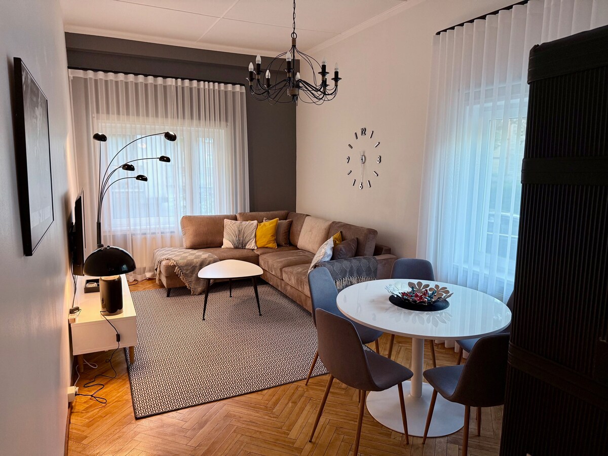 Enjoy your stay in our fully renovated apartment which is just an 8 minute walk from the Freedom Square and Old Town. Free Wifi and free private parking on site. Self check in and out. Our apartment is located in a historic building built in 1889 which is protected by the National Heritage Board. The building and the apartment are fully renovated. It is easy to get around the city center by foot, electric scooters and tram. Cafes, restaurants and grocery stores are close by.
