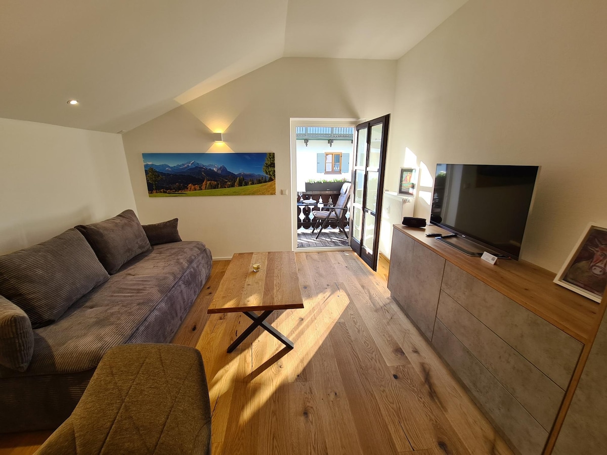 Nowo odnowione i starannie wyposażone mieszkanie z fantastycznym, niezakłóconym widokiem na góry Kramer i Alpy Ammergau oferuje na 27 m2 wystarczająco dużo miejsca na relaksujące wakacje w górach i jest idealnym miejscem dla par, małych rodzin lub przyjaciół do 3 osób. Apartament jest idealnie położony, aby móc korzystać z wielu atrakcji latem i zimą, a także znajduje się w odległości ok. 12 minut od centrum Garmisch. Kolejki górskie są dostępne w zaledwie kilka minut.