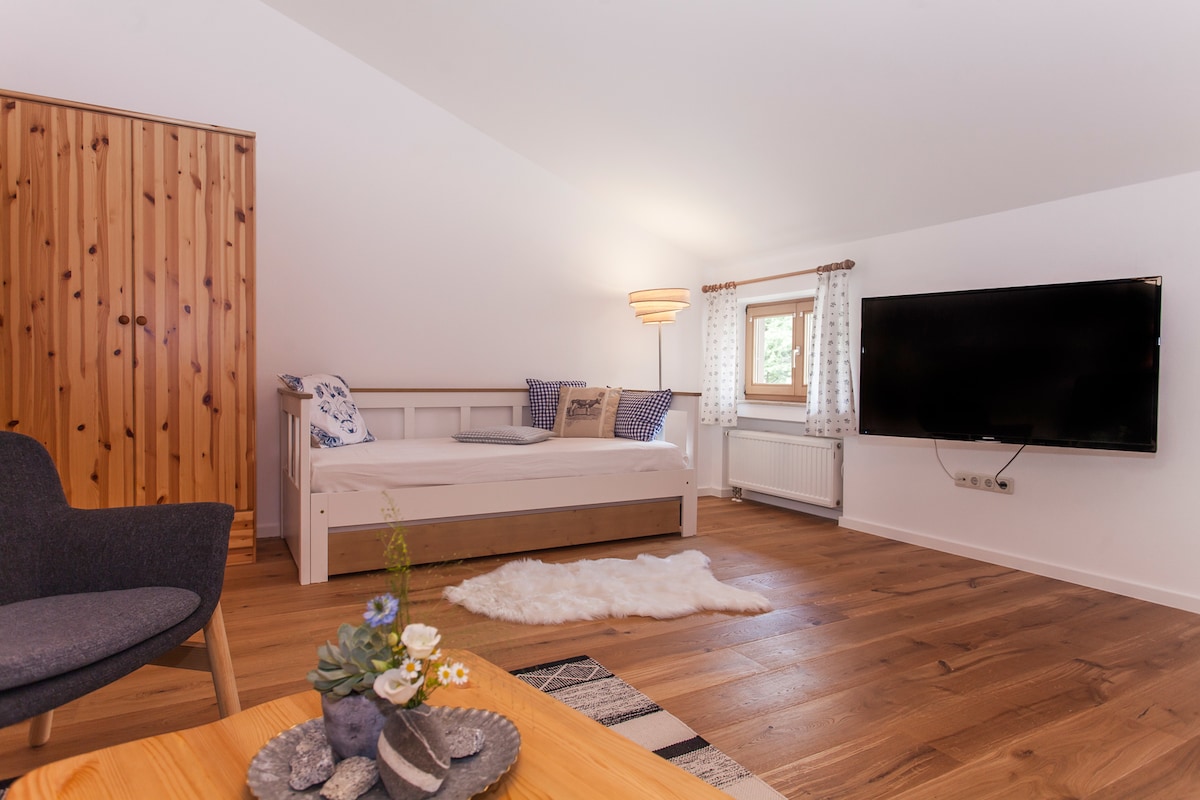 Region Garmisch-Partenkirchen to jedno z najpiękniejszych miejsc wakacyjnych w Niemczech. Nie tylko piękno przyrody czy tradycja ludności, ale także duża różnorodność zajęć rekreacyjnych sprawiają, że Kraina Werdenfelser jest wyjątkowa. Wynajmujemy przytulne mieszkanie na parterze z osobnym wejściem. Studio składa się z kuchni i salonu z dodatkową łazienką. Szczególnie docenisz przestronny taras południowy z dostępem do ogrodu.