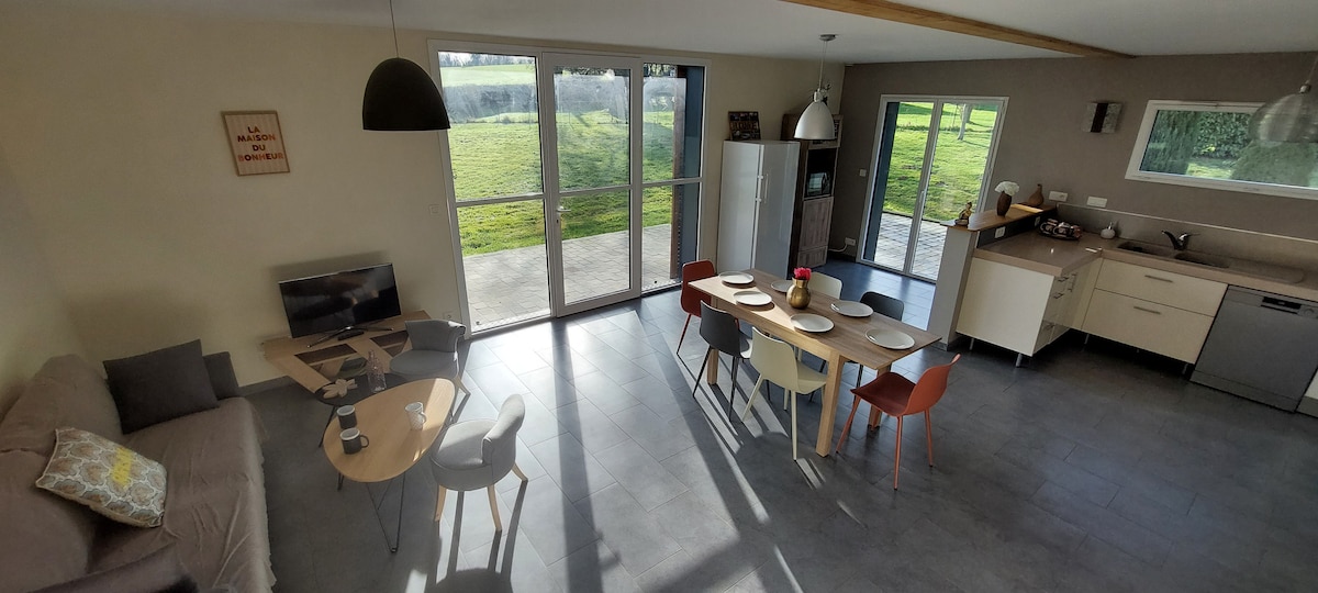 Niedawno odnowiony wiejski dom parterowy: jadalnia z kominkiem/piec na drewno otwarta na w pełni wyposażoną kuchnię (piekarnik, kuchenka gazowa i elektryczna, zmywarka, lodówka/zamrażarka, kuchenka mikrofalowa, ekspres do kawy Tassimo, toster), salon z telewizorem z dostępem do Internetu + światłowodem, sypialnia z podwójnym łóżkiem, łazienka z prysznicem i wanną, toaleta. Ogród z dużym parkingiem (możliwość wjazdu furgonetki i przyczepy). Pościel, ręczniki i ściereczki są zapewnione. Ogród o powierzchni 1380 m².