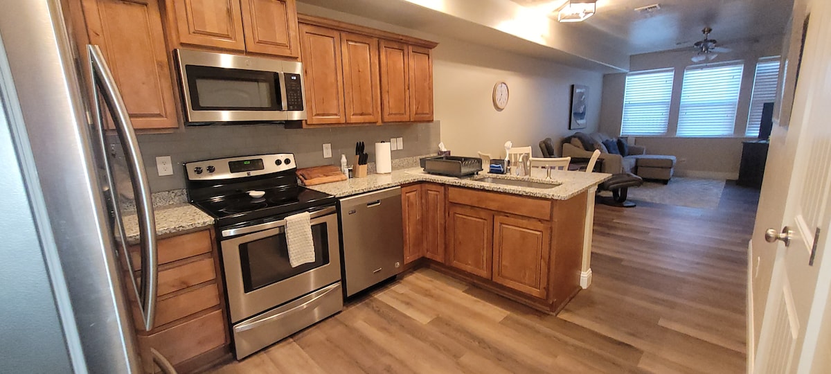 New flooring and carpet throughout!! Escape to our peaceful family retreat. Nestled in a quiet neighborhood with nearby shopping and dining. Unwind in the master bathroom's large jetted tub. Main floor boasts 3 bedrooms with a total of 4 beds, a cozy living room with a Samsung Frame TV, and upstairs, a kids' haven with games, toys, TV, and Nugget Couches. We provide coffee and cocoa pods for a Keurig coffee machine. We do also have a coffee pot if you wish to bring your own coffee.