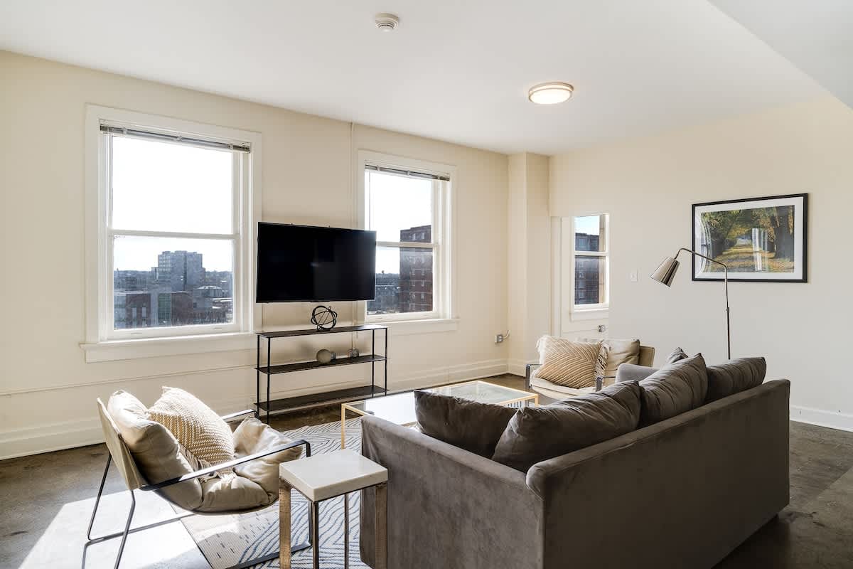 Położony w historycznym centrum Louisville, Derby City Loft jest prawdziwą atrakcją! Ten luksusowy apartament typu PENTHOUSE oferuje wspaniałe widoki i wysokiej klasy mieszkanie. Otwarty plan piętra oferuje 3 łóżka typu queen, zasłony można zaciągnąć, aby stworzyć 2 sypialnie. Dodatkowo na dużej sofie mogą wygodnie spać 2 osoby. W pełni wyposażone kuchnie i łazienki ze wszystkim! Ten dom został zaprojektowany i wystylizowany z myślą o Twojej wygodzie, zrelaksuj się i ciesz się wysokim stylem życia w Derby City Loft.