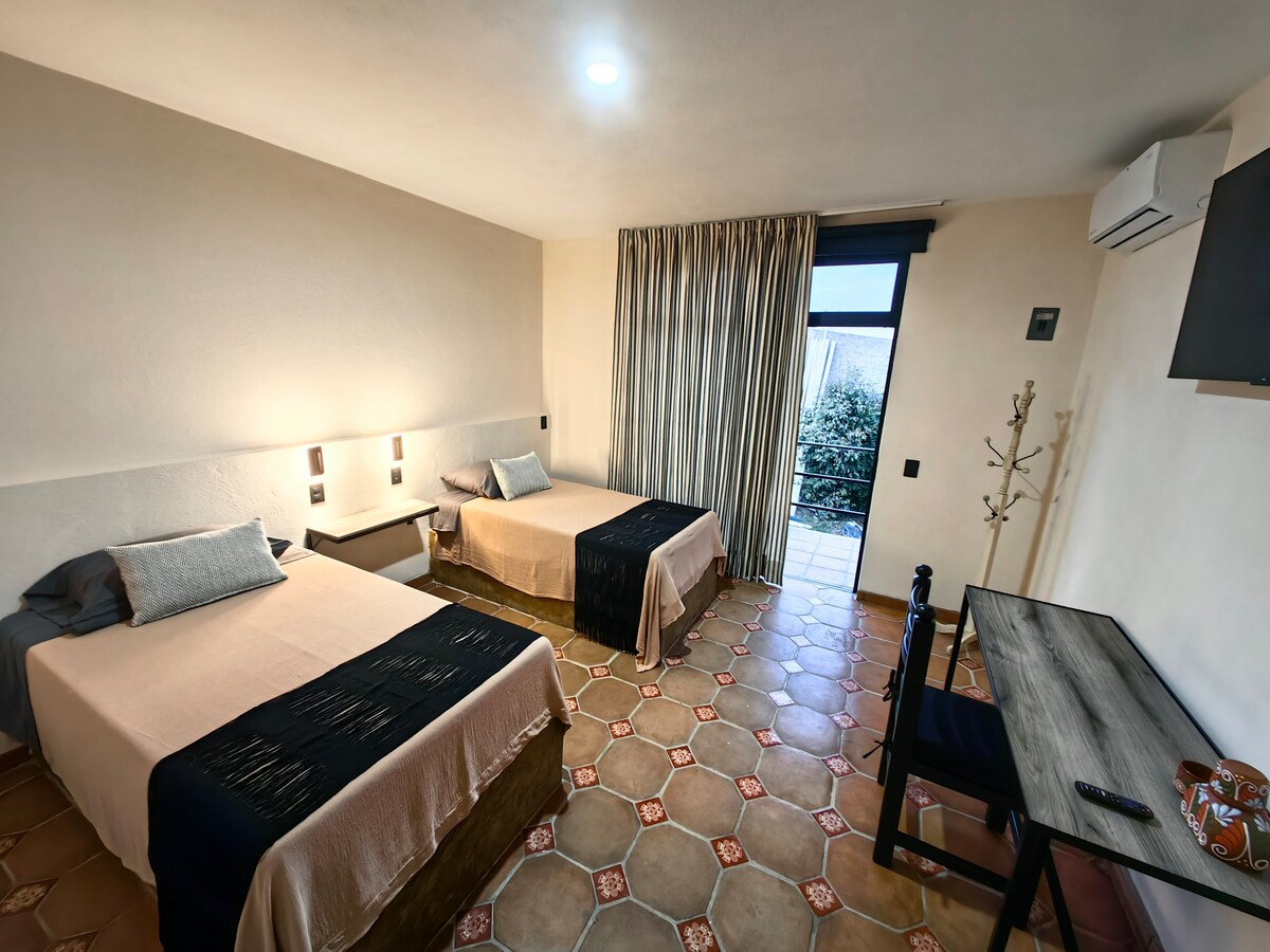 Amplia habitación de una cama queen size con una individual, excelente para descansar y preparar una deliciosa taza de café, cuenta con los utensilios básicos de la cocina, para que puedas preparar tus alimentos, cuenta con dos televisiones ambas con cable e Internet red Wifi de alta velocidad.