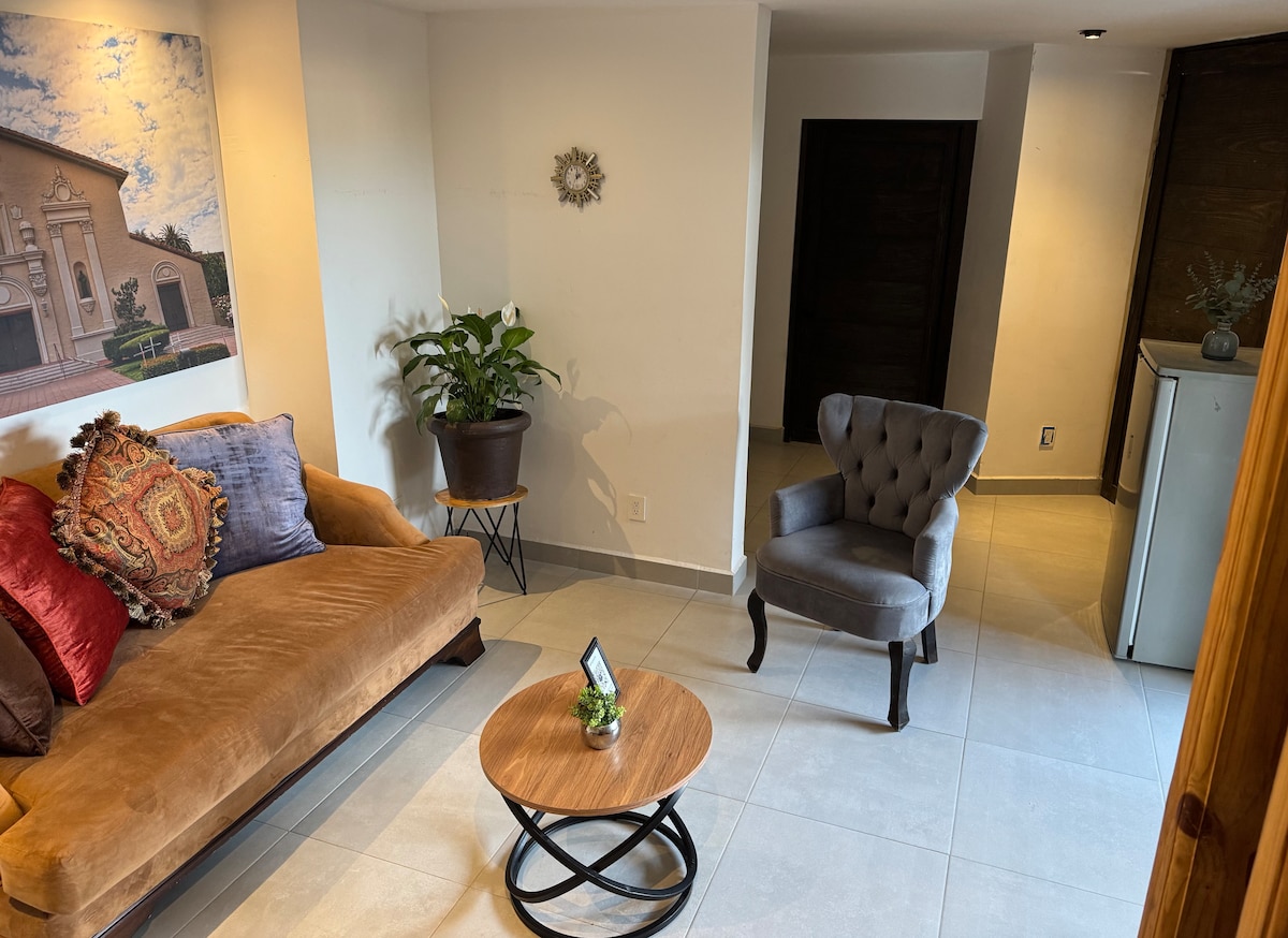 Witamy w naszym przytulnym apartamencie w stylu boho w Peña de Bernal! Ta wyjątkowa przestrzeń została starannie urządzona, aby zapewnić Ci relaksujące i spokojne wrażenia podczas pobytu. Dzięki ręcznie wykonanym akcentom i ciepłej atmosferze poczujesz się jak w domu od momentu przejścia przez drzwi. Ciesz się widokiem na zieleń regionu, relaksując się w naszym wygodnym salonie lub na przytulnym balkonie.