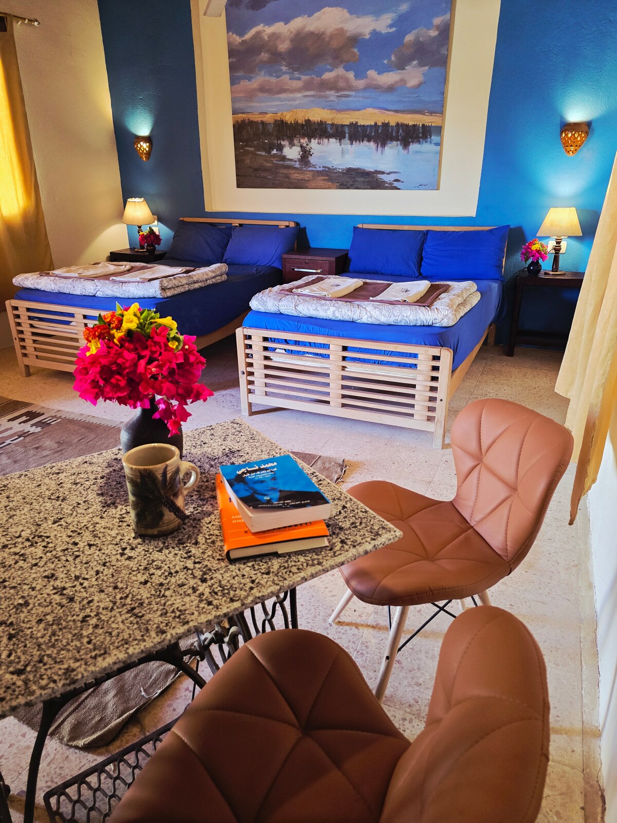 Jeden z sześciu pięknie zaprojektowanych pokoi w naszym uroczym pensjonacie „Dar Bul Bul”. Z ogrodem, basenem i dużym dachem z widokiem na jezioro Qaroun. Oferujemy śniadanie i możemy pomóc w zorganizowaniu dowolnej aktywności, która Cię interesuje (na przykład wycieczki na pobliską pustynię). Możemy również zorganizować dla Ciebie prywatnego kierowcę z Kairu, jeśli nie masz własnego samochodu.