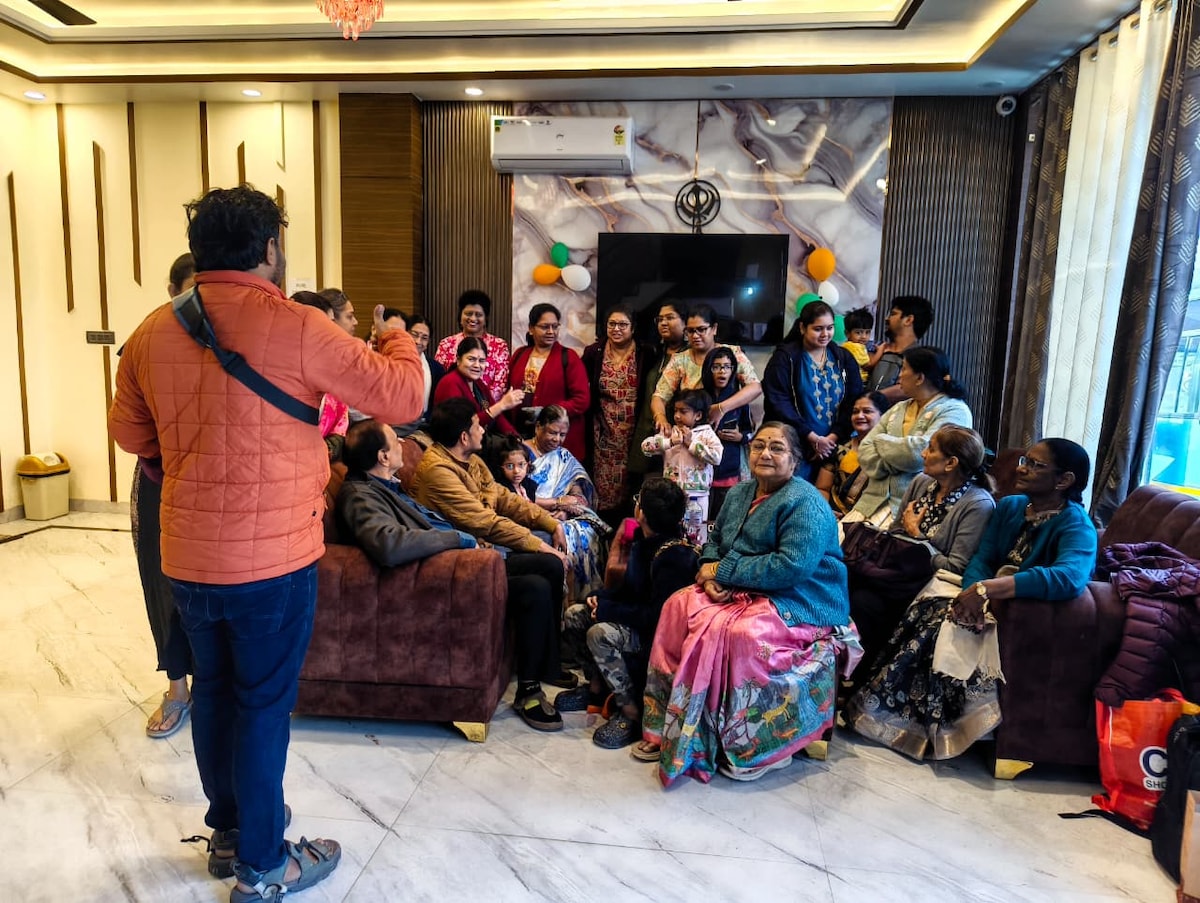 Witamy w The Saryu Vatika Homestay w Ajodhji – domu rodzinnej firmy trzeciej generacji na Rampath, zbudowanym w 1990 roku i niedawno odnowionym, aby zapewnić współczesny komfort. Ten przytulny dom parterowy z 4 sypialniami i 3 łazienkami oferuje klimatyzowane pokoje, Wi-Fi, telewizory Smart TV, kuchnię do parzenia herbaty/kawy oraz ogrodzony parking. Za symboliczną opłatą możesz delektować się pełnowartościowymi domowymi posiłkami przygotowywanymi przez naszego kucharza. Dzięki całodobowej opiece i bliskości lotniska Ayodhya to idealny dom z dala od domu.