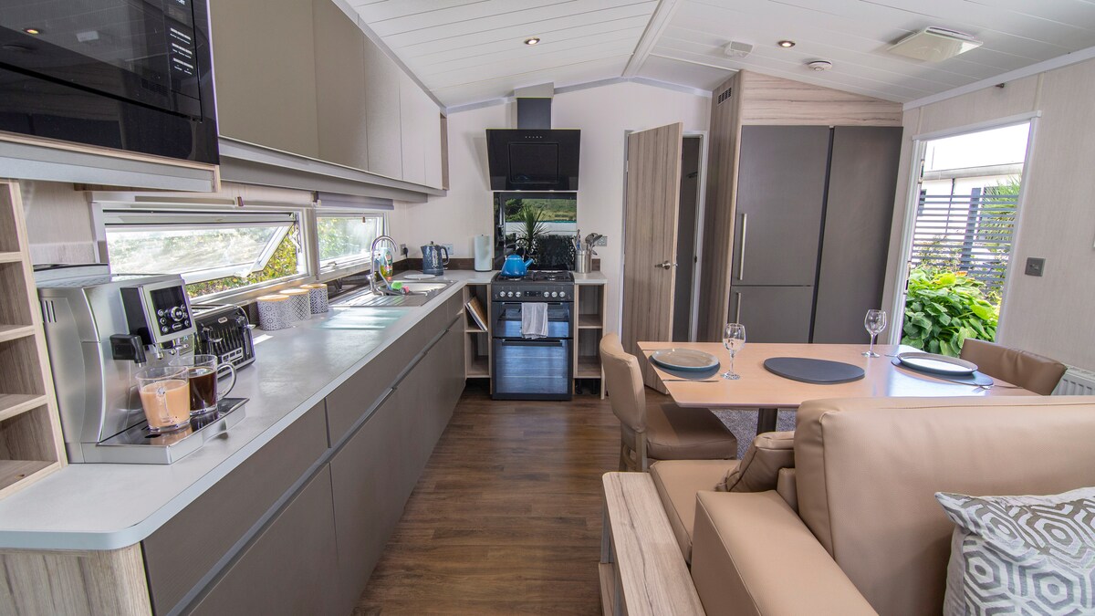 Luksusowa chata wakacyjna u stóp Twmbarlwm i słynnego Hillfort z epoki żelaza, dyskretnie wkomponowana w krajobraz, zapewniająca prywatne i relaksujące wakacje. Domek jest skierowany na południe w stronę góry Machen, a nasze przyjazne alpaki mieszkają tuż obok. - Bezpłatny pakiet powitalny – Prywatna wanna z hydromasażem i palenisko z grillem – 20 GBP za cały pobyt (zapłać, gdy będziesz na miejscu) - Dodatkowe kłody 10 GBP za worek Uwaga **Maksymalne obłożenie 5 osób dorosłych/4 osoby dorosłe 2 dzieci poniżej 16 lat** NIE 6 OSÓB DOROSŁYCH PRZEPRASZAMY
