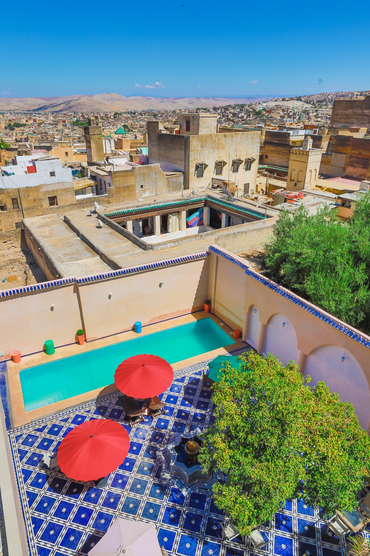 Położony w samym sercu Fes medina, Shazam SPA Palace zaprasza do odkrycia oazy spokoju, w której spotykają się luksus i tradycja. Odkryj nasz nowy pokój z basenem i widokiem na miasto w Palais Shazam & Spa. Ten pokój oferuje wyjątkową perspektywę, w której można podziwiać zarówno basen, jak i uroki Medyny z Fezu. Wyposażony, aby sprostać oczekiwaniom gości z zagranicy, gwarantuje komfort i relaks. Daj się uwieść wyjątkowej atmosferze.